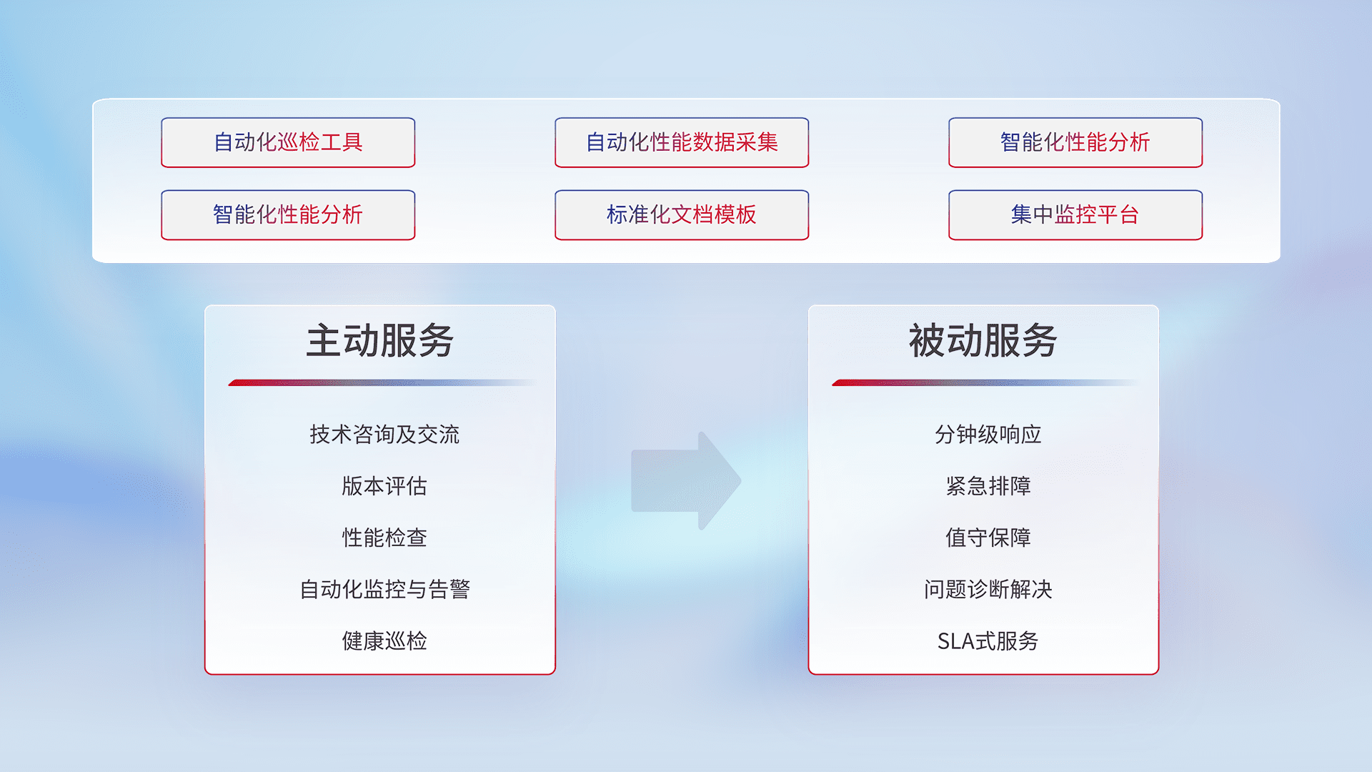 智能化工具和标准化文档,,,,保障服务质量,,提供主动服务(包含技术咨询、、、、版本评估、、、、性能检查、、、自动化监控与告警、、、、健康巡检)和被动服务包含(分钟级响应、、、、紧急排障、、、值守保障、、、问题诊断解决、、、SLA服务)。。